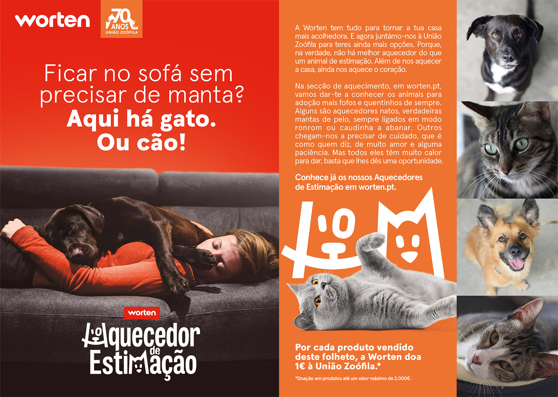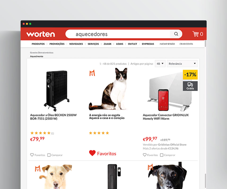 Não há melhor solução para aquecer uma casa do que um animal de estimação. Por isso, neste inverno – e numa altura em que o abandono animal disparou devido à pandemia – a Worten juntou-se à União Zoófila para promover a adoção de animais na secção de aquecimento do seu site. O site da Worten é o site mais visitado em Portugal, o que contribuiu para impactarmos de uma forma original e surpreendente os visitantes. Durante o período da campanha, quem foi a worten.pt à procura de um aquecedor deparou-se com alguns dos muitos cães e gatos que continuam à espera de uma casa para aquecer, e pôde candidatar-se para os adotar. Aliás, o número de candidaturas ultrapassou mesmo o número de animais disponíveis para adoção no site. Resultado: há muitas pessoas que vão passar este inverno, e os próximos, com a casa e o coração bem mais quentinhos.